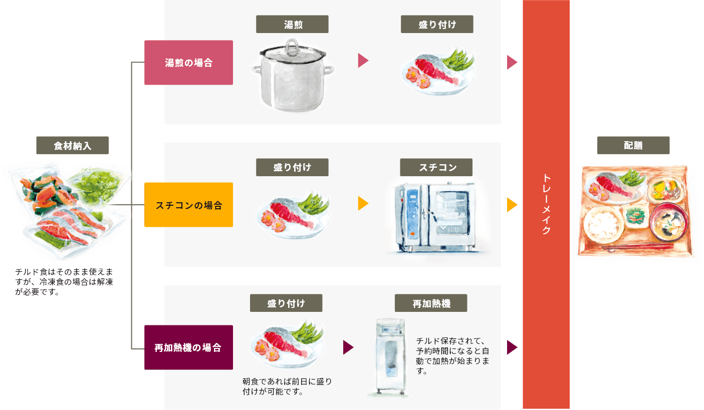 冷凍食、チルド食の加熱には、湯煎・スチコン(スチームコンベクションオーブン)・再加熱機の